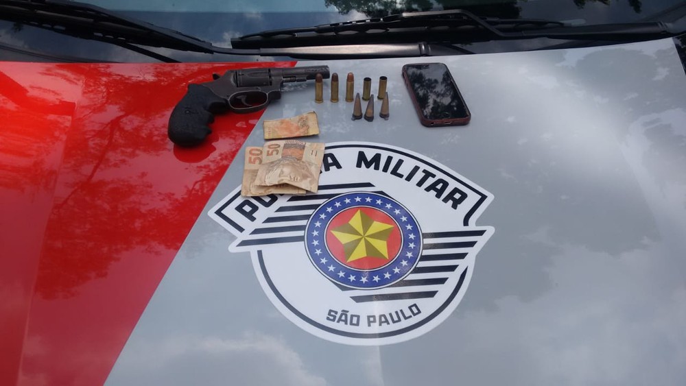 Arma e celular foram apreendidos com criminoso detido durante assalto na rodovia Anchieta (SP) — Foto: Divulgação/Polícia Militar