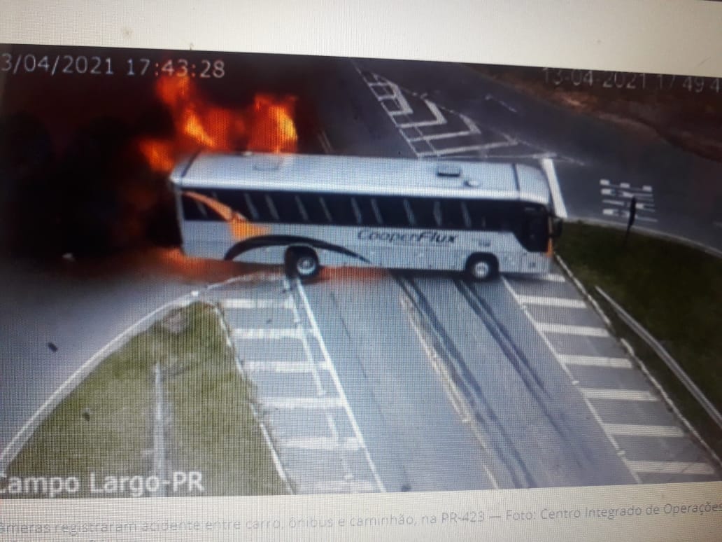 Câmeras registram momento de acidente entre carro, ônibus e caminhão, na PR-423; uma pessoa morreu