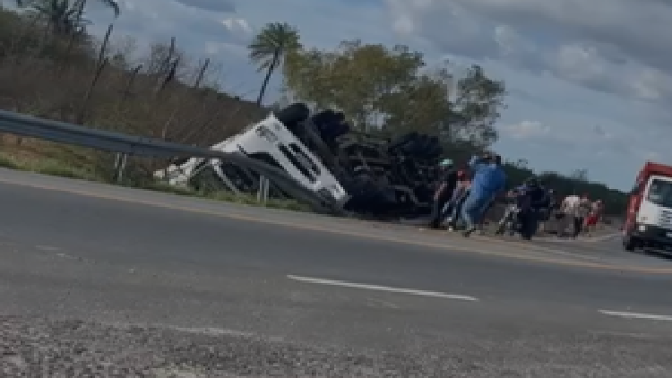 Uma carreta tombou na BR-407, nas proximidades da estátua do Burrinho, na zona rural de Petrolina, na tarde da terça-feira (9).